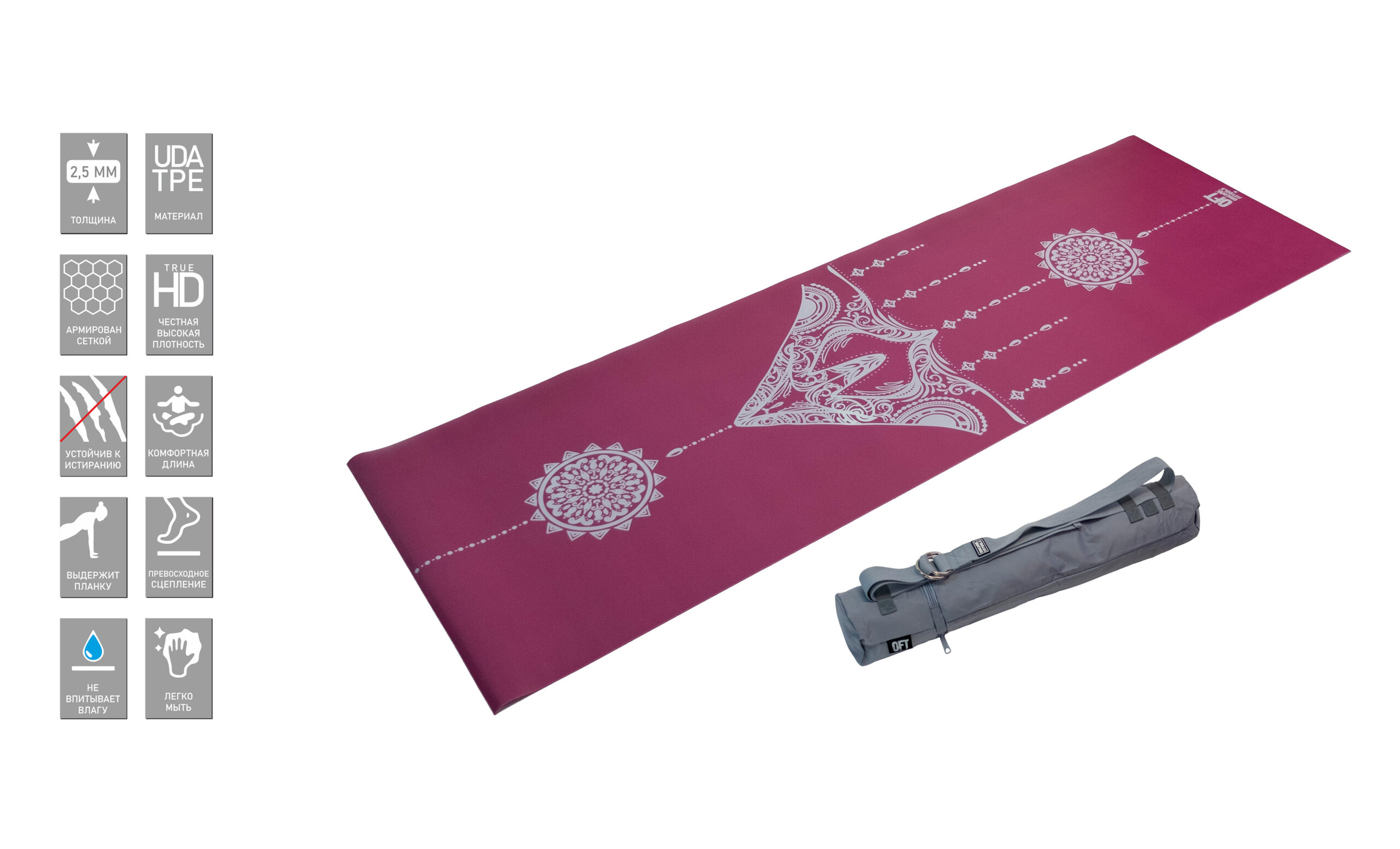 Коврик для йоги 2.5 мм пурпурный в сумке с ремешком