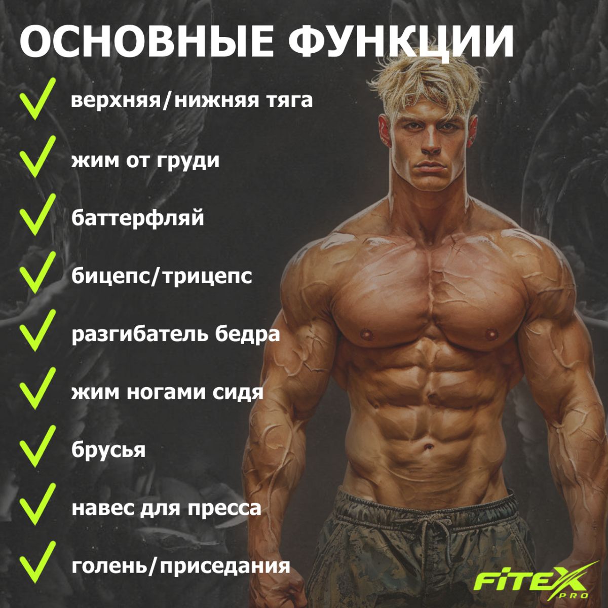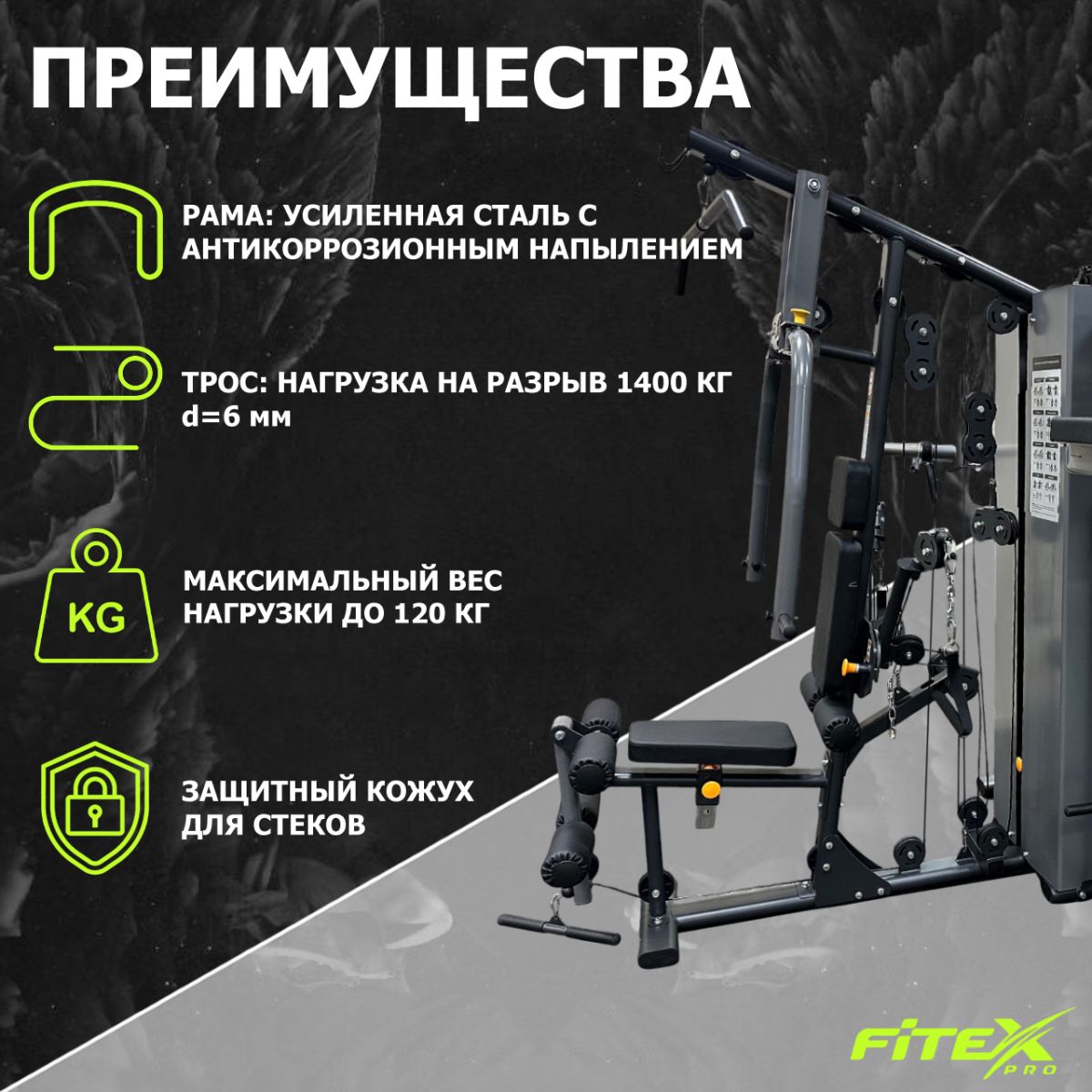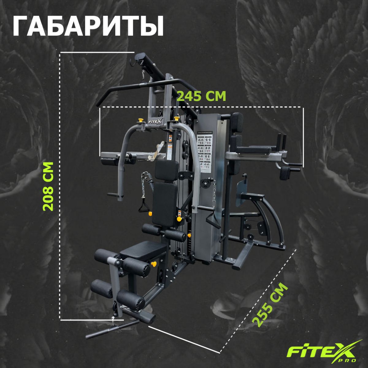 | Основные функции | Верхняя/нижняя тяга, жим от груди, баттерфляй, бицепс/трицепс, разгибатель бедра, жим ногами сидя, брусья, навес для пресса, голень/приседания с нагрузкой (диски в комплект не входят) |