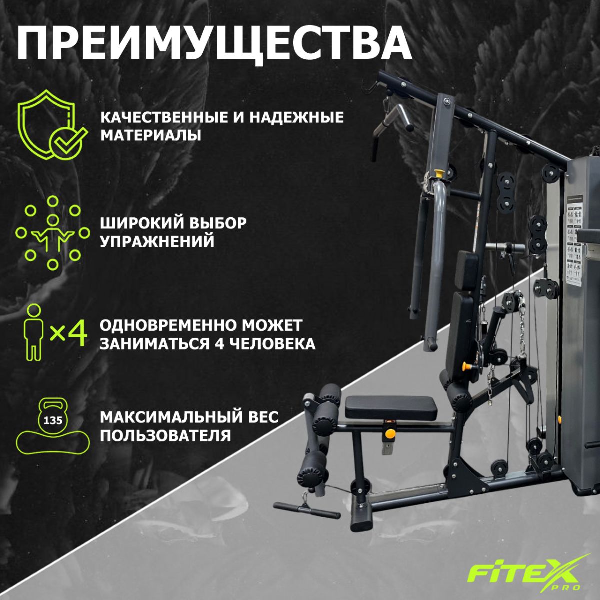 FTX-5205 4-х позиционная станция "LUGANO" — это четырехпозиционная мультистанция от производителя Fitex Pro, предназначенная для корпоративных и домашних спортзалов. Позволяет одновременно заниматься четырем людям, выполняя более 22 видов упражнений на все основные группы мышц. "LUGANO" является универсальным решением для небольших залов, так как позволяет оптимизировать пространство не уменьшая при этом функционал тренажера. Регулировка нагрузки происходит с помощью встроенной системы грузоблочных плит + возможность использовать диски, что позволяет подобрать оптимальную нагрузку для широкого круга пользователей. Мультистанция имеет множество регулировок, что позволяет адаптировать тренажер под пользователей с разными ростовыми характеристиками. Траектория движения является фиксированной, что позволяет выполнять упражение правильно даже начинающим пользователям, а также минимизирует риск получить травму. Станок относится к серии профессиональных тренажеров Fitex Pro.