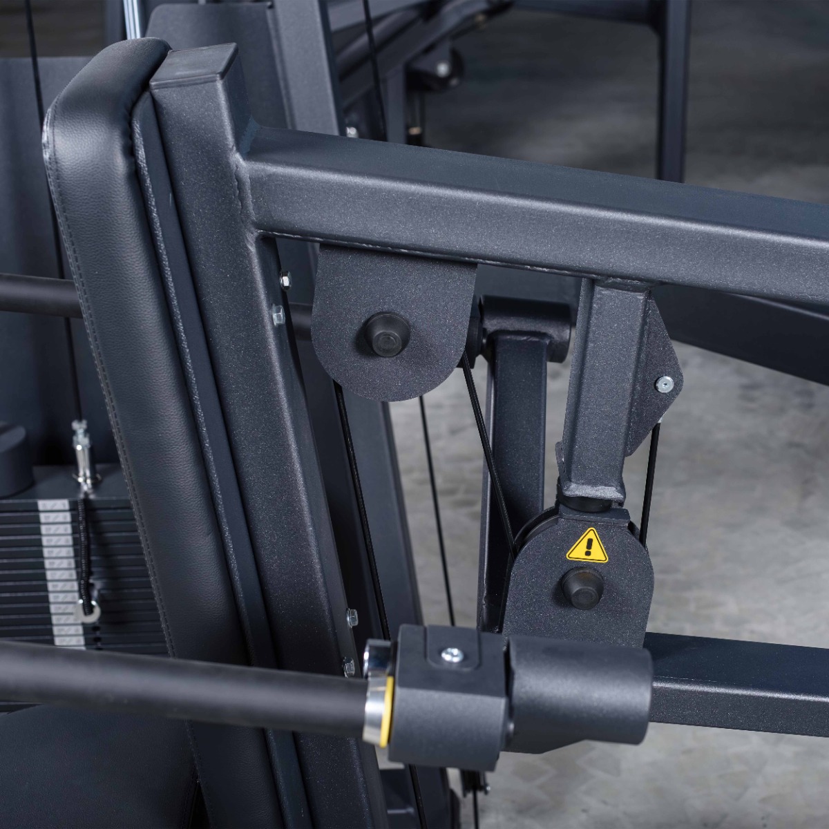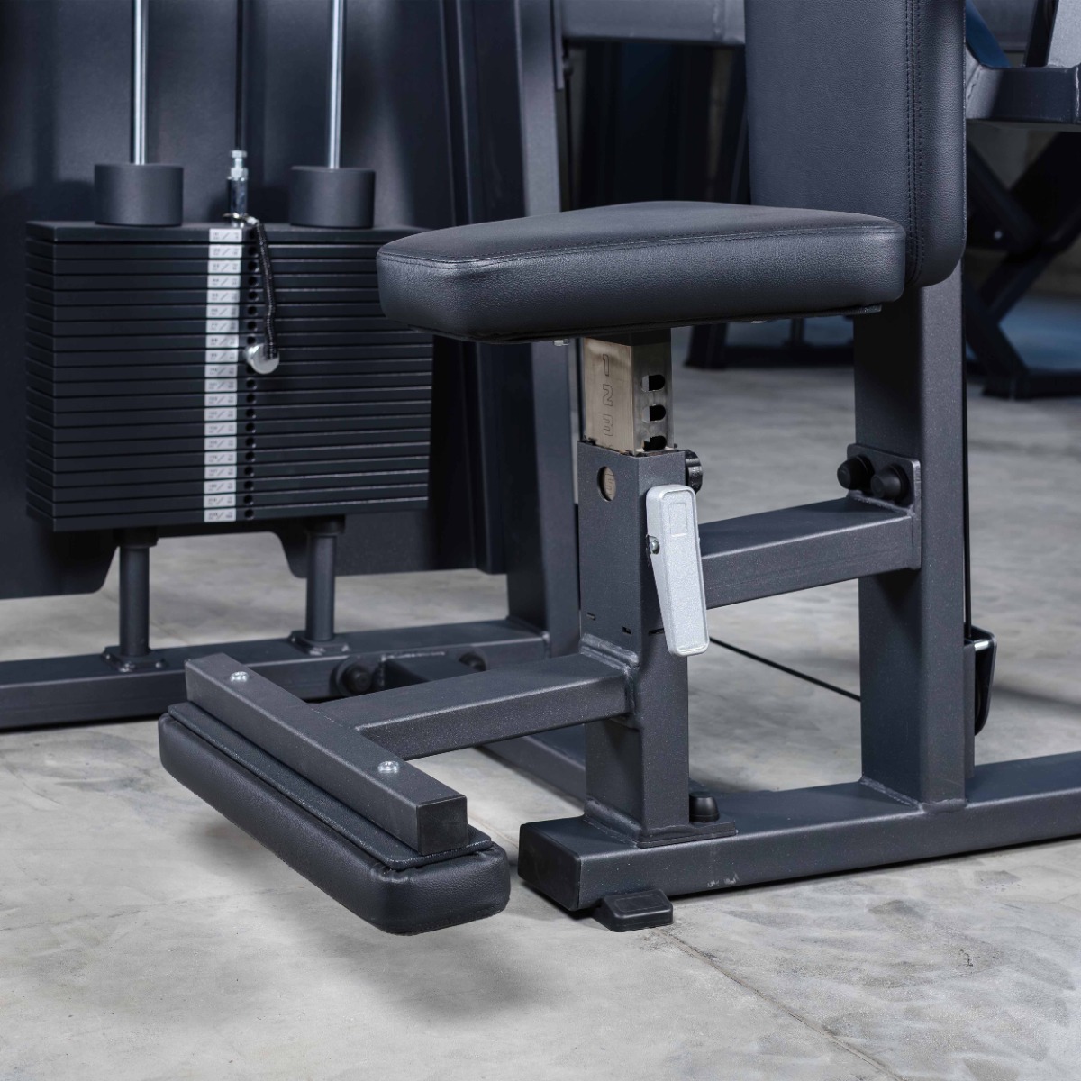 Система нагрузки – тросовая, с весовым стеком 100 кг. Весовой стек выполнен из стальных плит с порошковым покрытием.