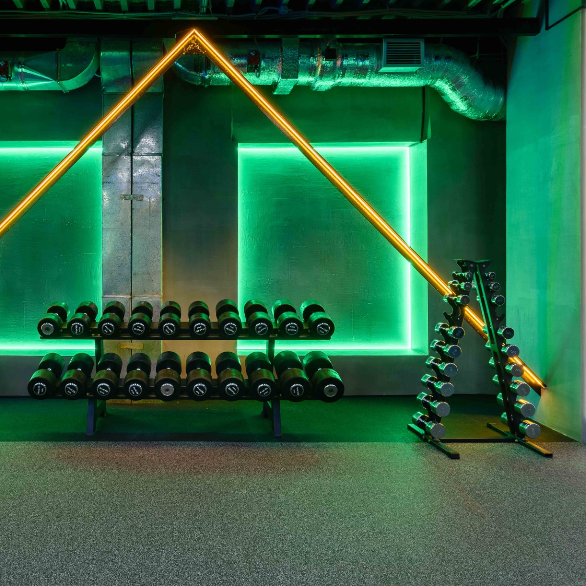 На каждой полке установлены чашеобразные пластиковые ложементы (всего 40 шт.), обеспечивающие надёжную фиксацию гантелей и предотвращающие повреждение поверхности полок.