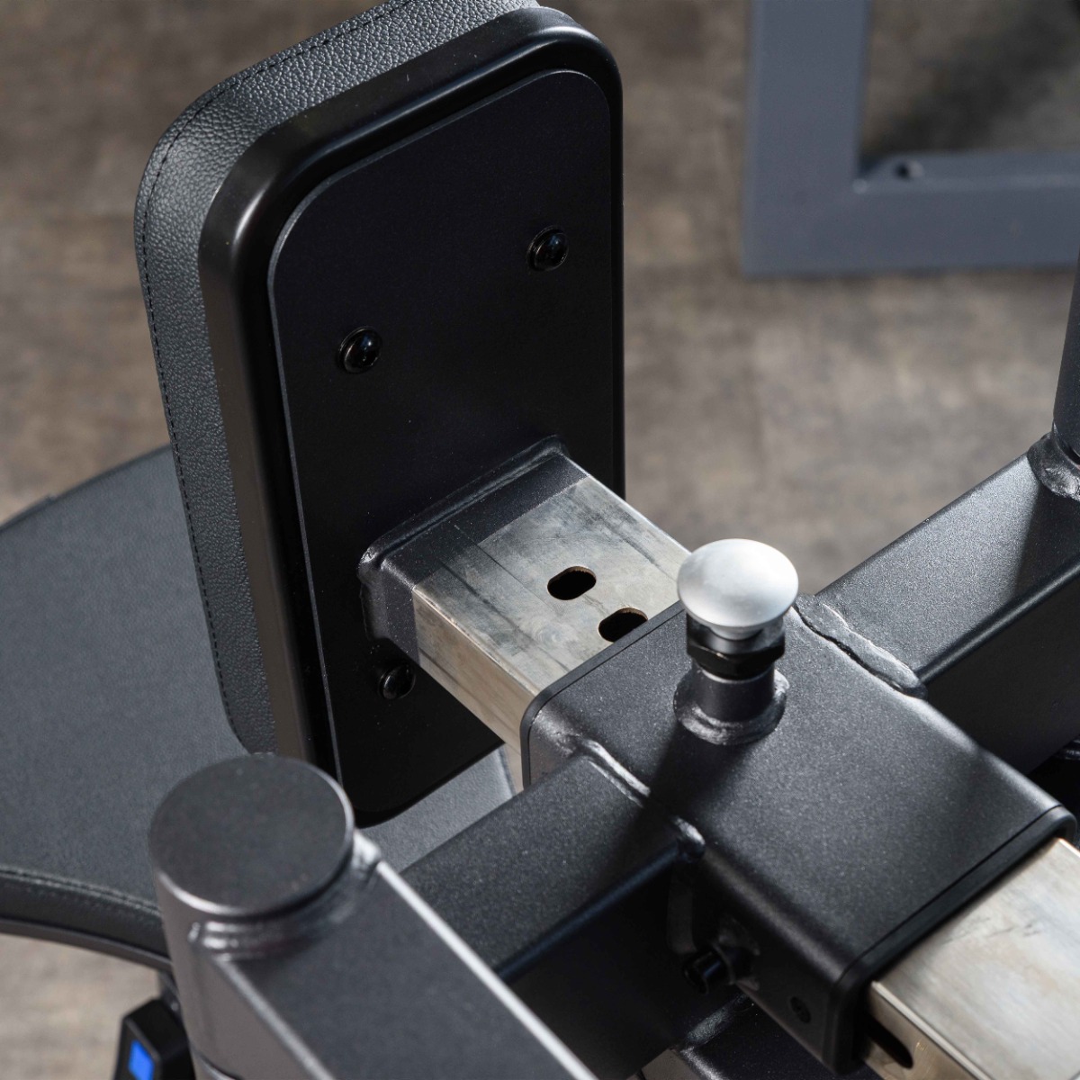 На каждом рычаге установлены две рукояти – вертикальная и горизонтальная. Вертикальные рукояти длиной 115 мм предназначены для акцентированной проработки трапециевидных мышц, горизонтальные рукояти длиной 150 мм – для изолированной нагрузки на задние пучки дельтовидных. Диаметр рукоятей 30 мм, рабочие зоны покрыты мягкой ромбовидной накаткой. Торцы оборудованы металлическими заглушками, зафиксированными болтовым соединением.
