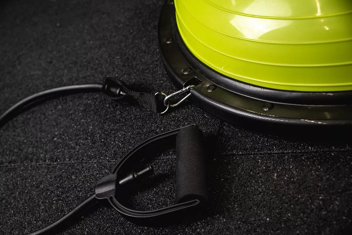 Основание платформы выполнено из высокопрочного пластика, а купол из латекса. Диаметр 540мм, а максимальная нагрузка на платформу 120кг. Ручки-эспандеры и насос входят в комплект поставки.