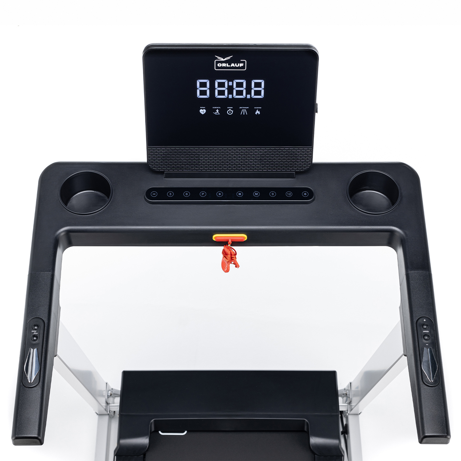 Все показатели тренировки отображаются на LED-дисплее, у которого можно менять угол наклона. Перед дисплеем предусмотрено место для смартфона. Под дисплеем располагается понятная сенсорная консоль с кнопками настройки тренировок, а также обычными и быстрыми кнопками изменения скорости. На поручнях расположены сенсорные датчики пульса и дублирующие кнопки скорости и запуска тренировки.