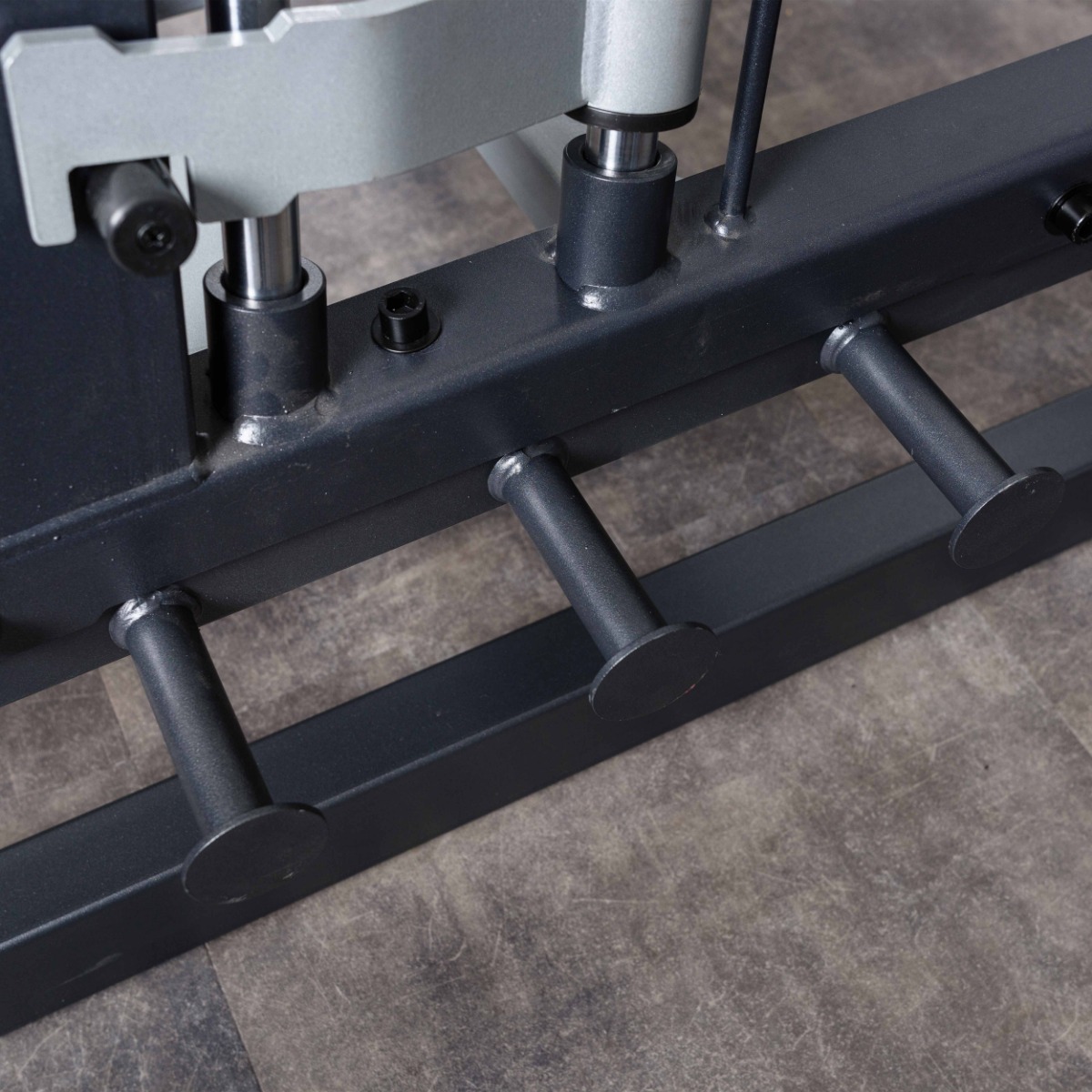На раме тренажера установлено шесть хромированных накопителей из толстостенной стальной трубы для хранения свободных весов и два на подвижных рычагах.