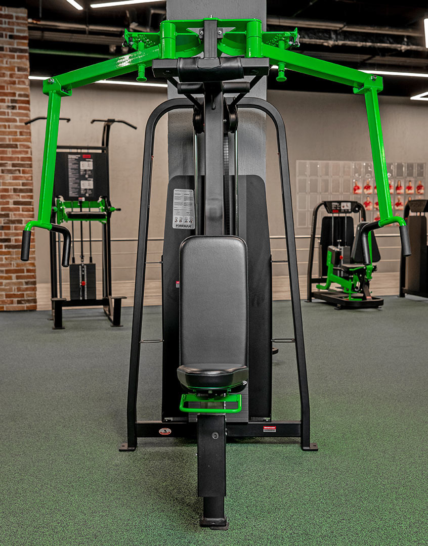 Баттерфляй. Исполняемое движение: сведение рук. Тренируемая группа мышц: большая грудная, трицепс, передние дельты.