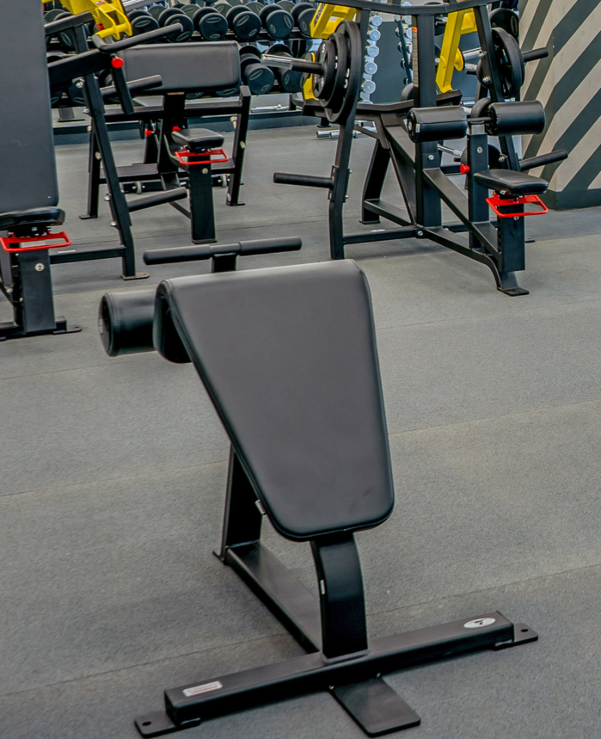 Скамья акцентирует нагрузку на мышце брюшного пресса и косых мышцах живота.
