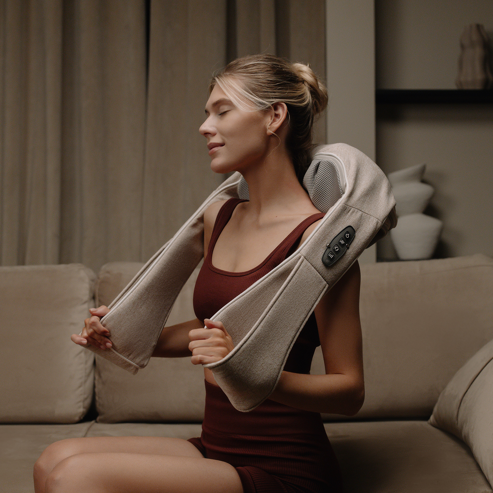 Дополнительная функция — прогрев. Он помогает быстрее расслабит мышцы и продлевает эффект от массажа.