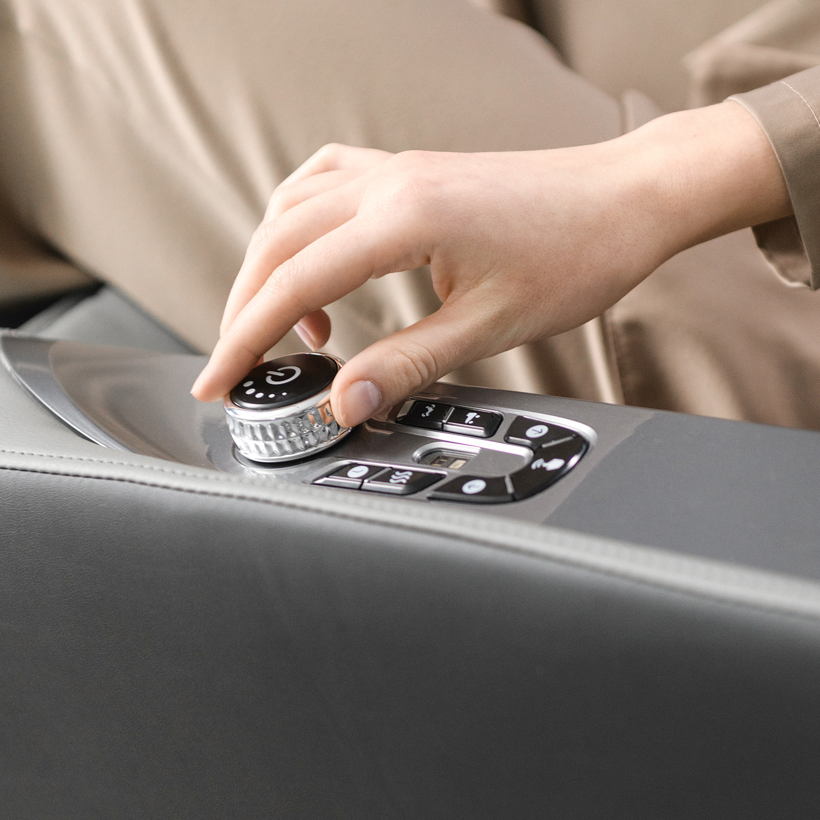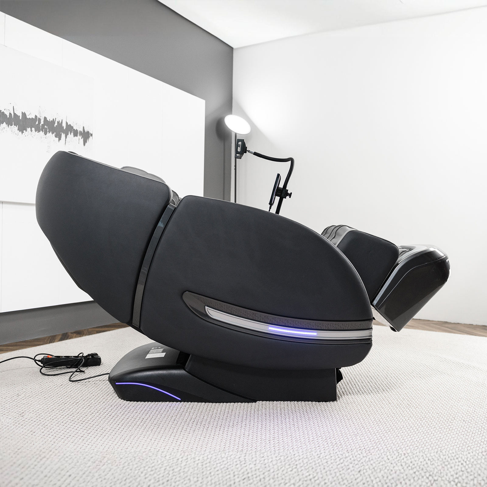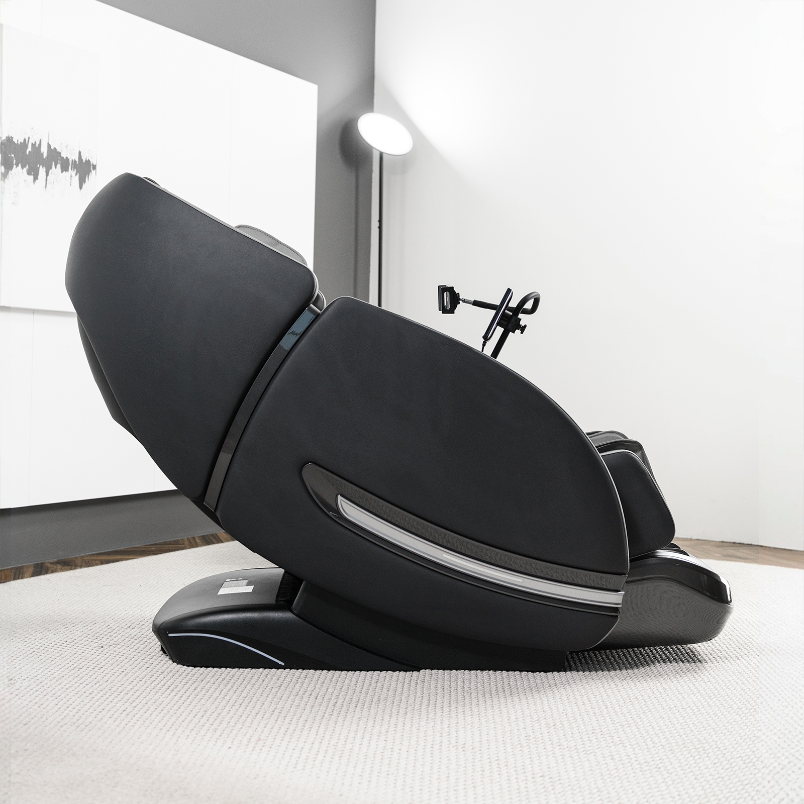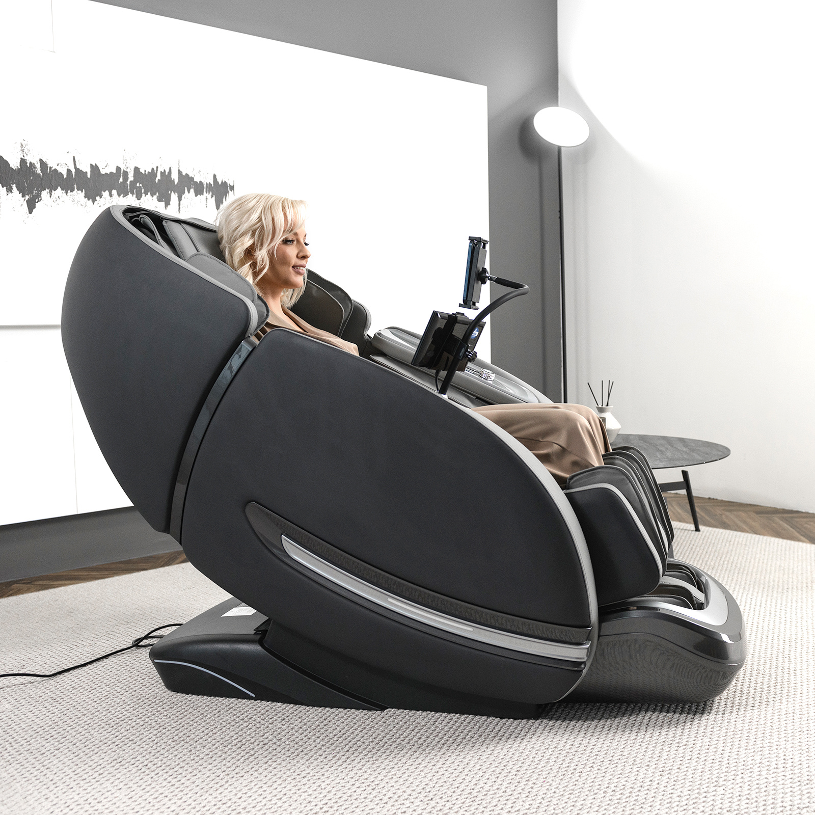 Управление осуществляется через интуитивно понятный планшет и кнопки быстрого доступа. Для комфортного использования смартфона во время сеанса предусмотрена специальная кнопка для пролистывания лент соцсетей EasySlide™, расположенная в зоне для пальцев. В подлокотник встроены беспроводная зарядка для смартфона и подвижная подставка для гаджетов. Встроенные Bluetooth-колонки позволяют наслаждаться любимой музыкой во время сеанса массажа.