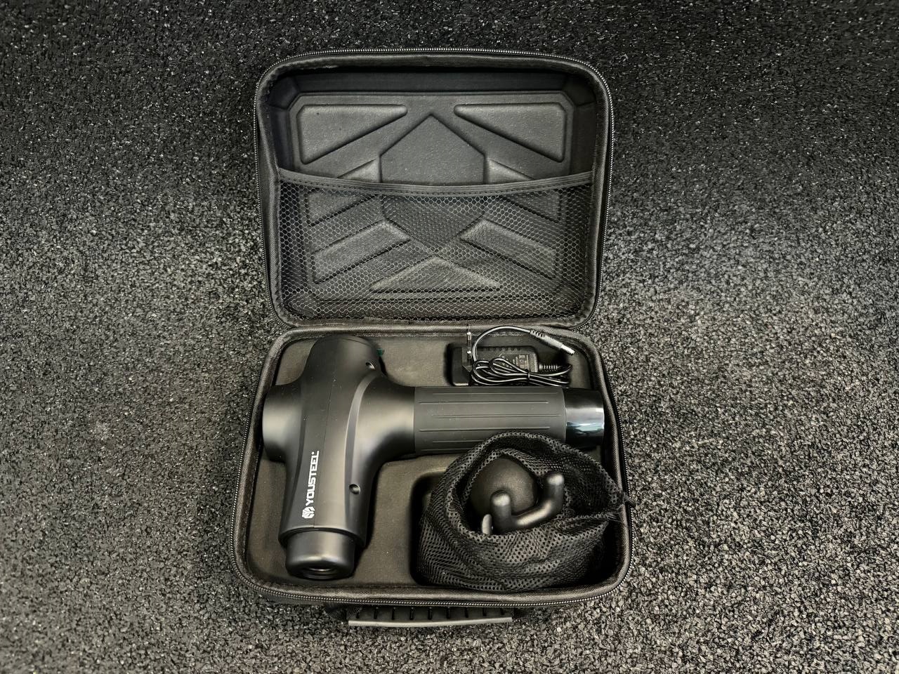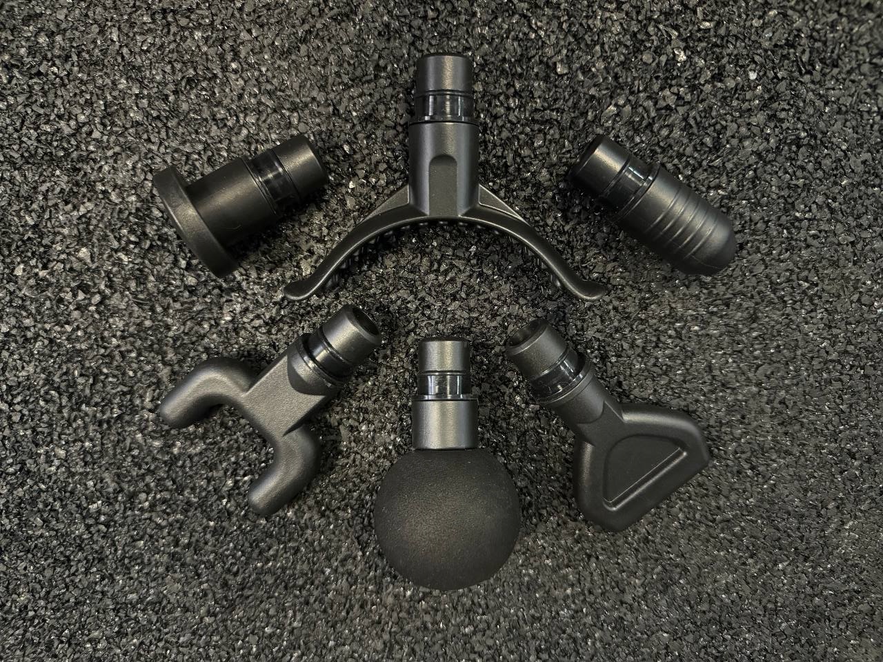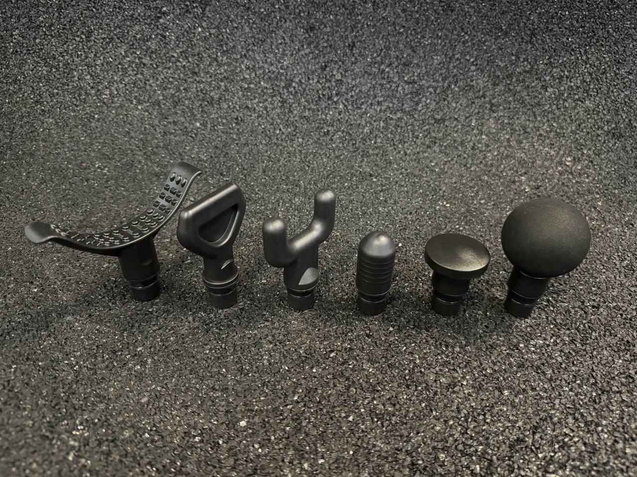 В комплект входят: блок зарядки 12.5v/1а, кейс для переноски/хранения, массажный пистолет, 6 насадок.