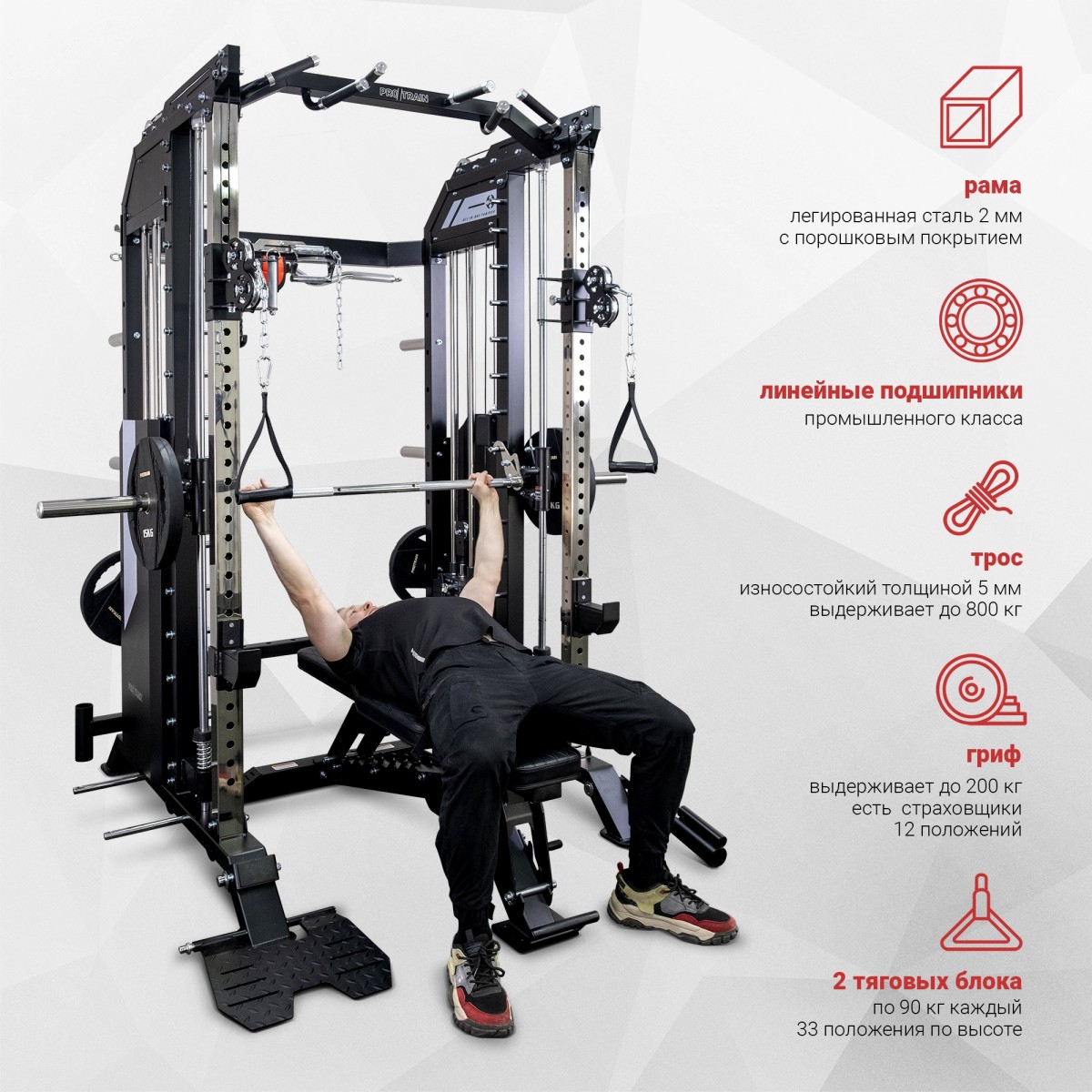 Область применения: Профессиональная;Весовой стек (одна сторона): 90 кг;Размеры товара в сборе: 170 х 199 х 230 см.
