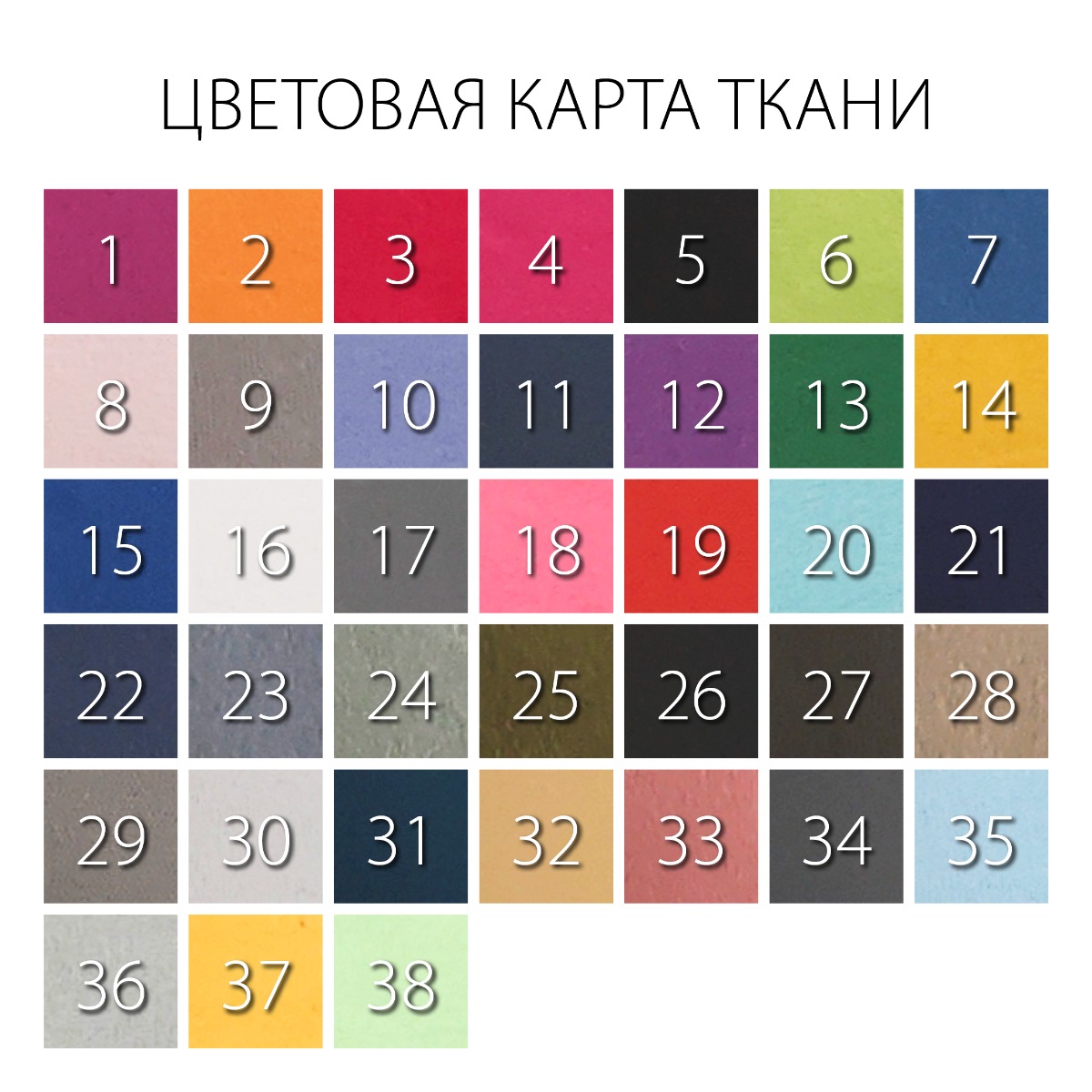 Пояснения к цветовой карте ткани (см. фото): №1 Bright Purple (2415 C), №2 Orange (Hexachrone Orange C), №3 Rubin Red, №4 Fuchsia (Hexachrone Magenta C), №5 Black, №6 Apple Green (375 C), №7 Blue (285 C), №8 Pink (12-1310 TPX), №9 Grey (17-1502 TRX), №10 Taro Purple (2705 C), №11 Navy Blue (19-4025 TPX), №12 Dark Purple (19-3439 TPX), №13 Dark Green (355 U), №14 Yellow (14-0955 TPX), №15 Royal Blue (18-4051 TPX), №16 White, №17 Charcoal Grey (18-0601 TPX), №18 Phosphor, №19 Red (485 C), №20 Blue Radiance (14-4816 TPX), №21 Indigo, №22 Dark Blue (4030 TCX), №23 Wathet (624 U), №24 Pea Green (17-0421), №25 Army Green (0422), №26 Cool Gray, №27 Dark Gray (18-0202), №28 Light Gray (V4), №29 Light Gray, №30 Pale Grey (4103), №31 Plue Green, №32 Khaki, №33 Peach Pink (14-1909), №34 Cold Grey (11 C), №35 Baby Blue (290 C), №36 Warm Gray (2 C), №37 Orange (150 C), №38 Apple Green (358 C).
