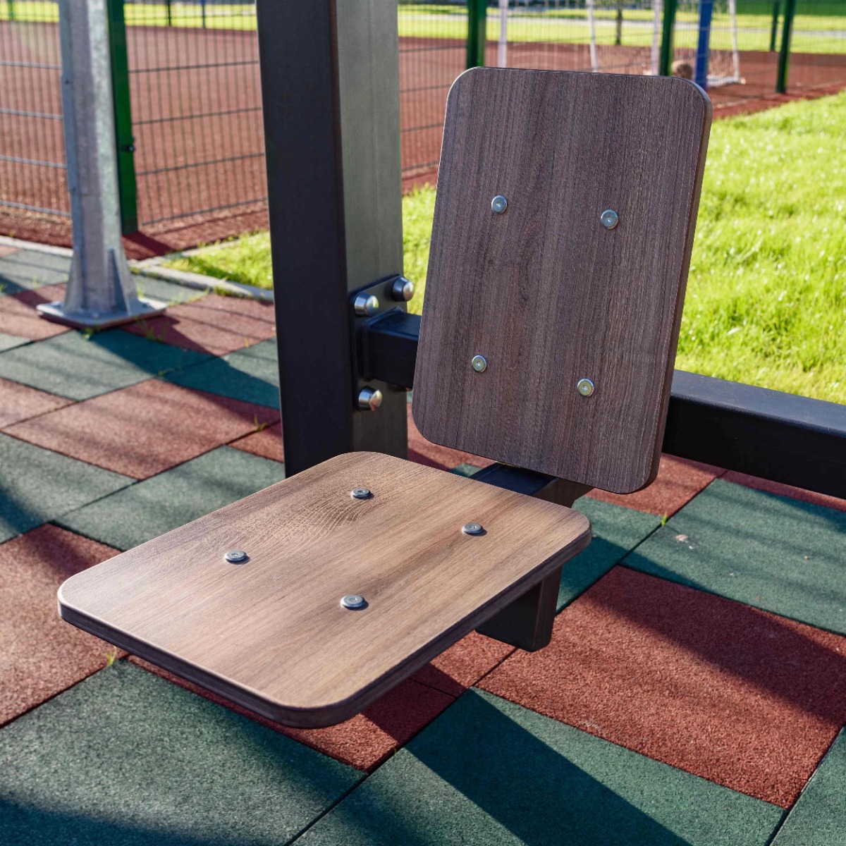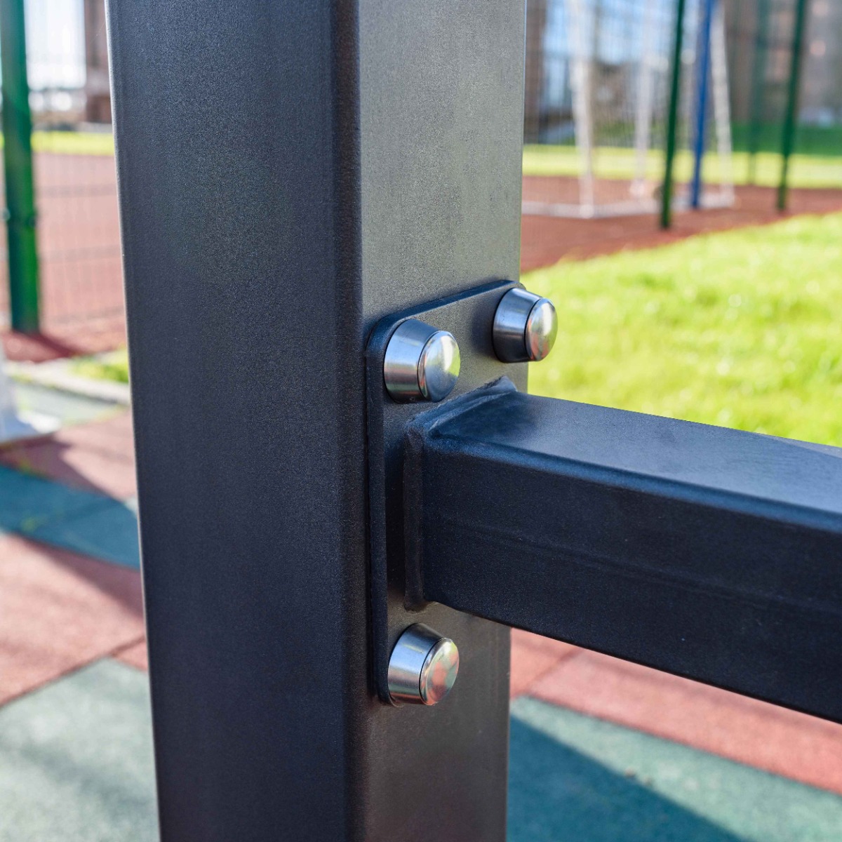 Надёжность и прочность разъёмных соединений конструктивных элементов тренажёра обеспечиваются за счёт использования высококачественного оцинкованного крепежа, выступающие части которого закрыты металлическими защитными колпачками.