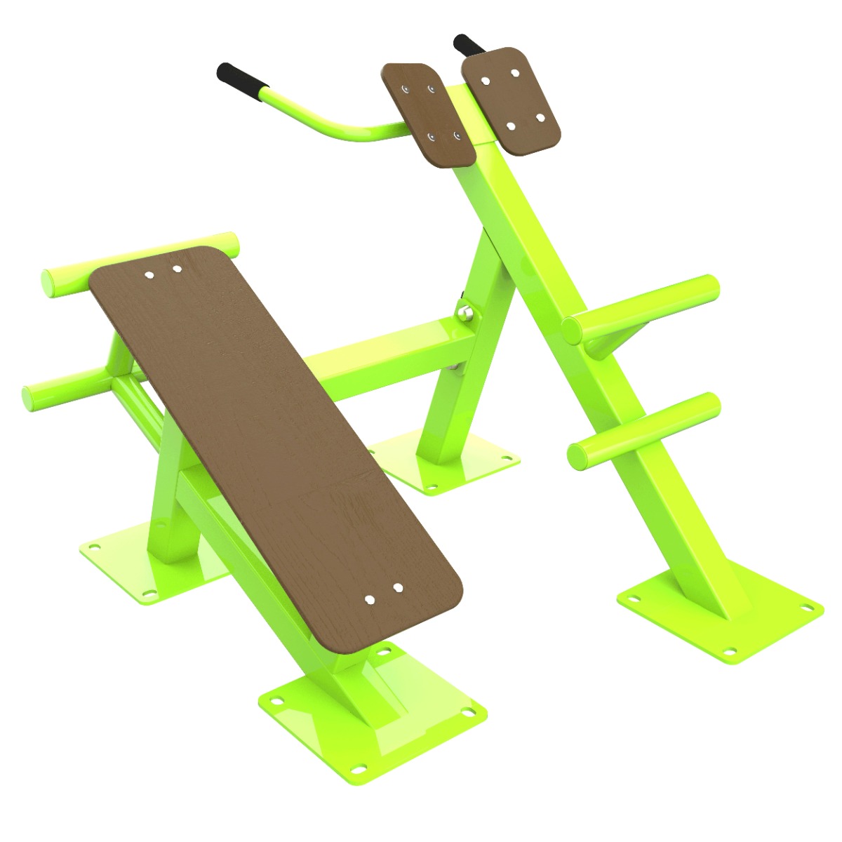 Металлические элементы покрыты цинкосодержащим грунтом, формирующим антикоррозийный слой в результате химической реакции компонентов грунта с металлом, и порошковой краской с шагреневой фактурой, запечённой в печи полимеризации. Шагреневое покрытие повышает устойчивость поверхности к механическим повреждениям и маскирует следы эксплуатации.
