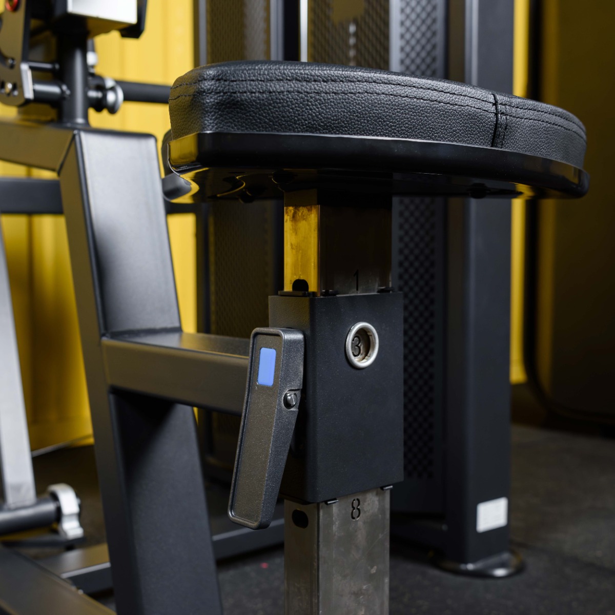 Яркий полуавтоматический фиксатор желтого цвета регулировки положения сиденья и подушки для груди, регулируется в 8-ми положениях.