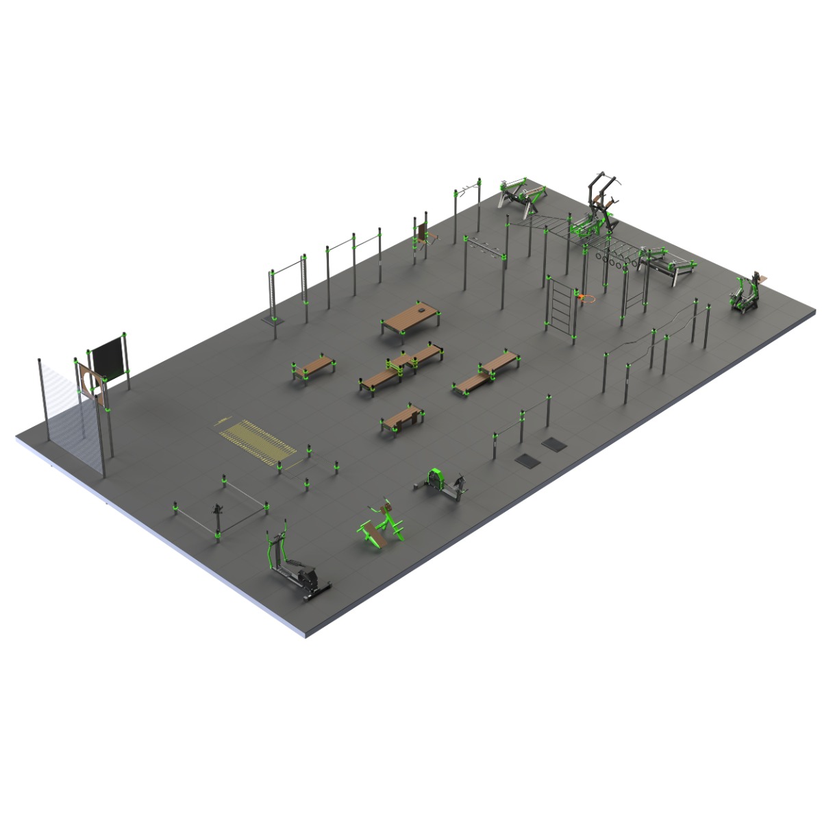 В составе комплекса предусмотрена стойка для гирь, выполненная из стальной трубы диаметром 89 мм с крюками из листового металла толщиной 4 мм и накладками из пластика толщиной 12 мм. Конструкция предназначена для безопасного размещения и хранения гирь различного веса во время проведения испытаний и тренировок.
