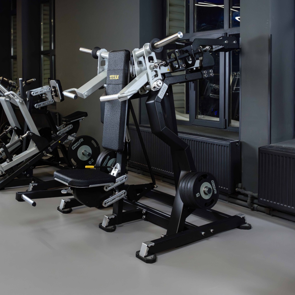 На подвижных рычагах для работы со свободными весами установлено два литых хромированных накопителя из толстостенной стальной трубы для дисков с посадочным диаметром 50 мм.