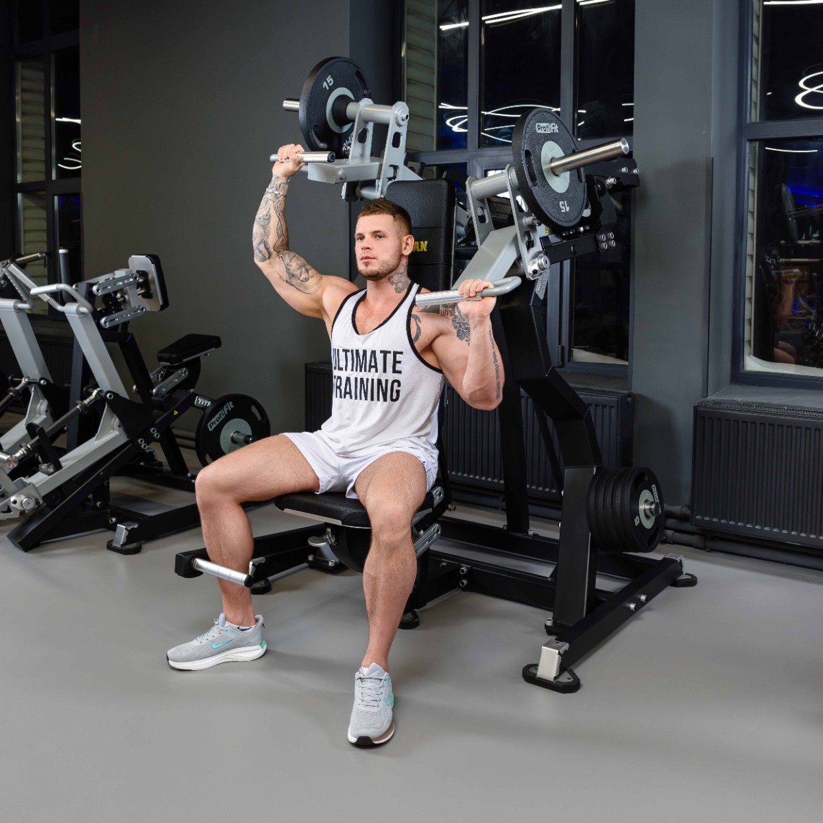 Профессиональный тренажер для коммерческого использования Y935ZAM Жим от плеч предназначен для упражнений на развитие дельтовидных мышц и трицепсов.